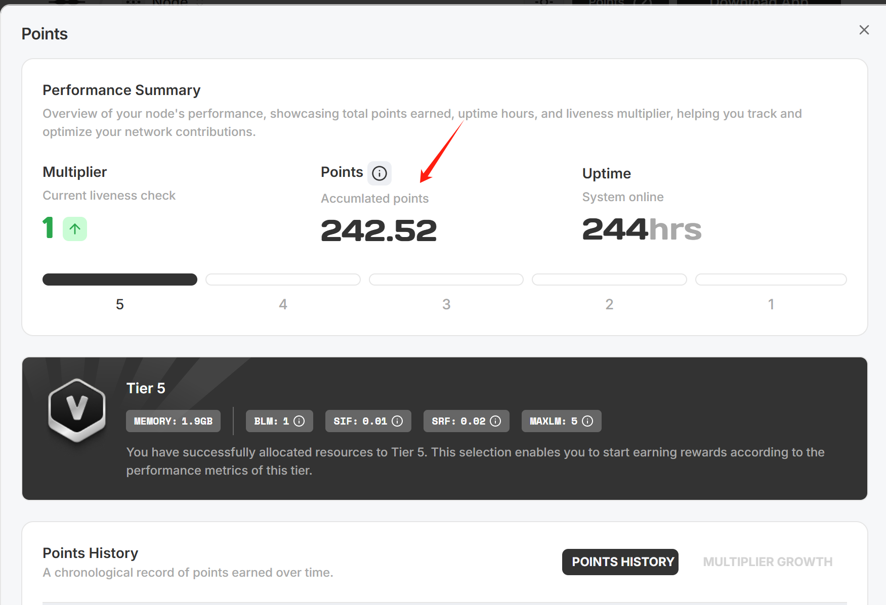 Points 是积分 ,Tier 是资源占用等级,5 最低, 1 最高, Multiplier 倍率, 根据提供的算力, 随时间增加。