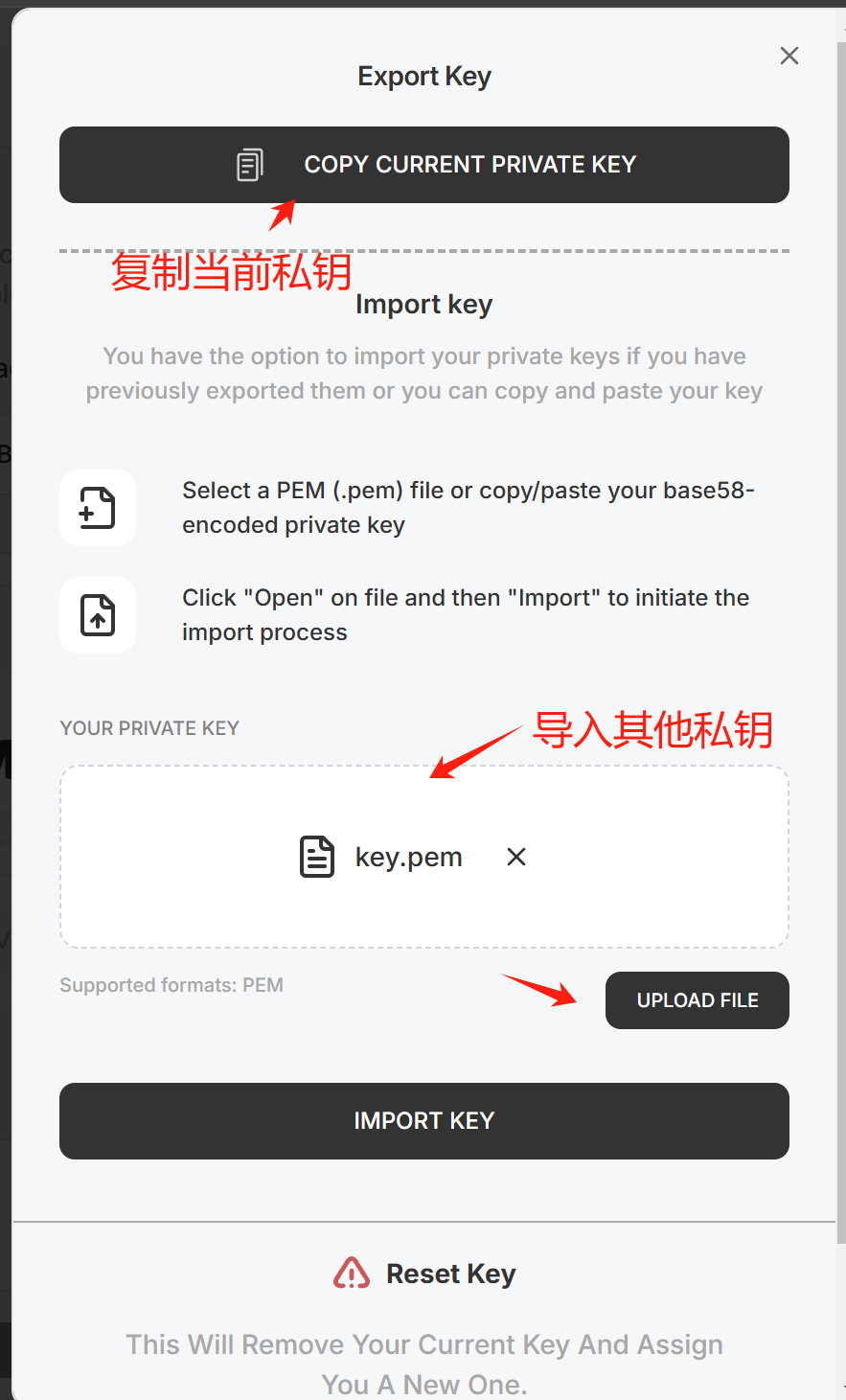 key.pem 密钥文件复制到其他设备, 或者导入网页版, 都是可以的。