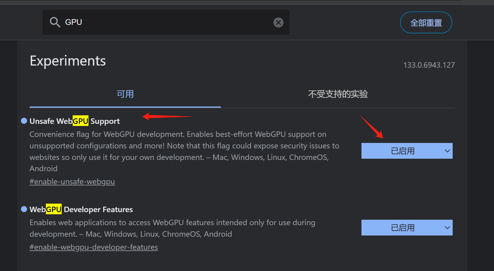 *提示:网页端节点如果提示:”Unsafe WEBGPU", 操作如下: 网址上输入 chrome://flags -> 搜索 "GPU" -> 设置 Enabled -> Relaunch 重启浏览器