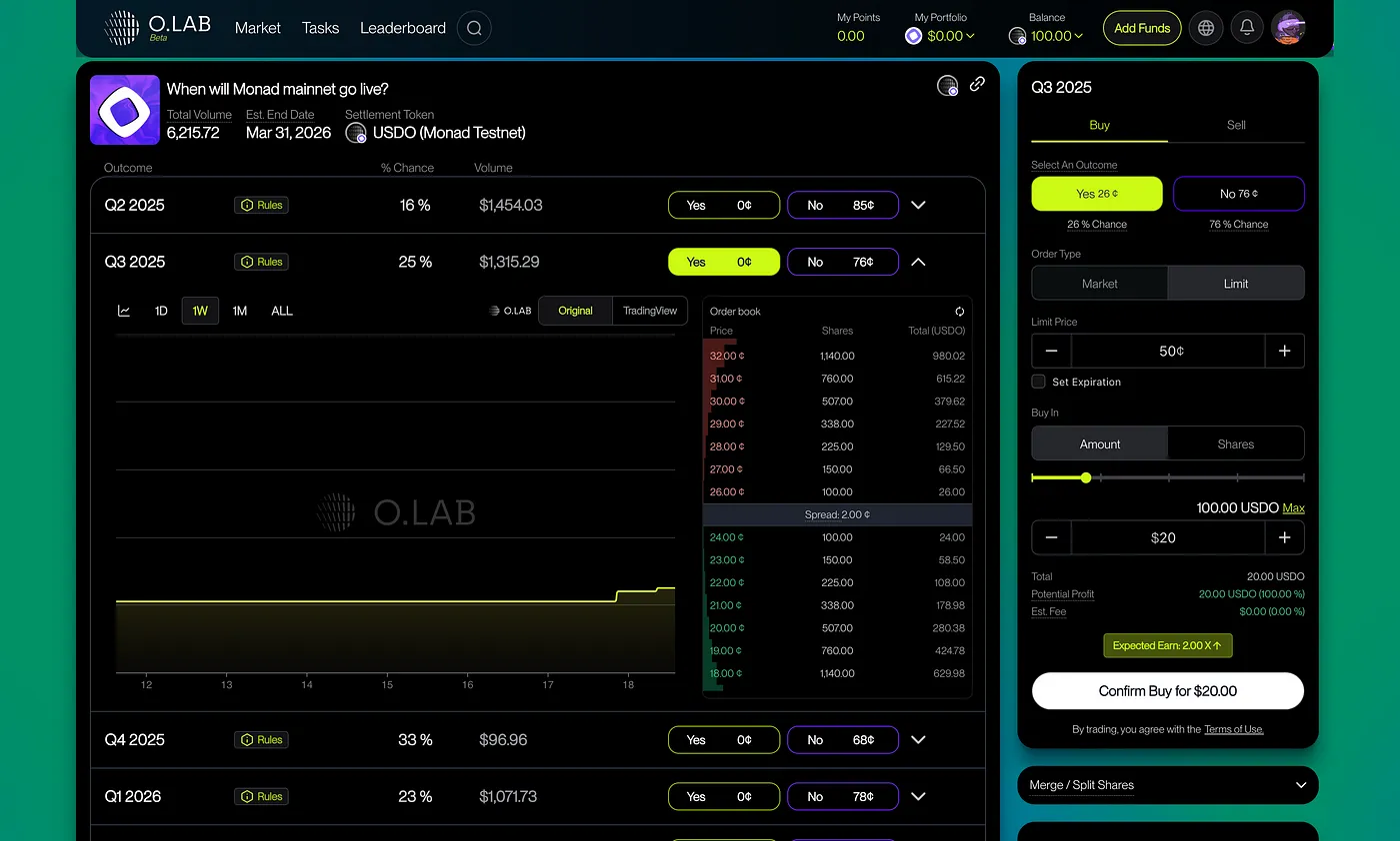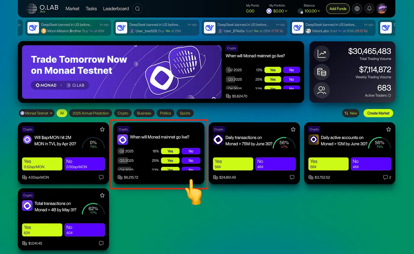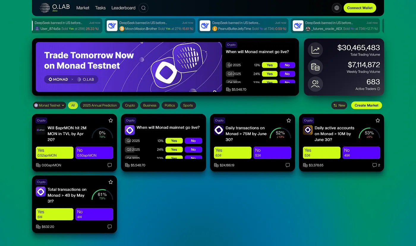 由 YZi labs 、Amber 顶尖机构领投500w美金的O.LAB,目前部署再monad测试网,可以一鱼多吃,零成本大家一定要参与!