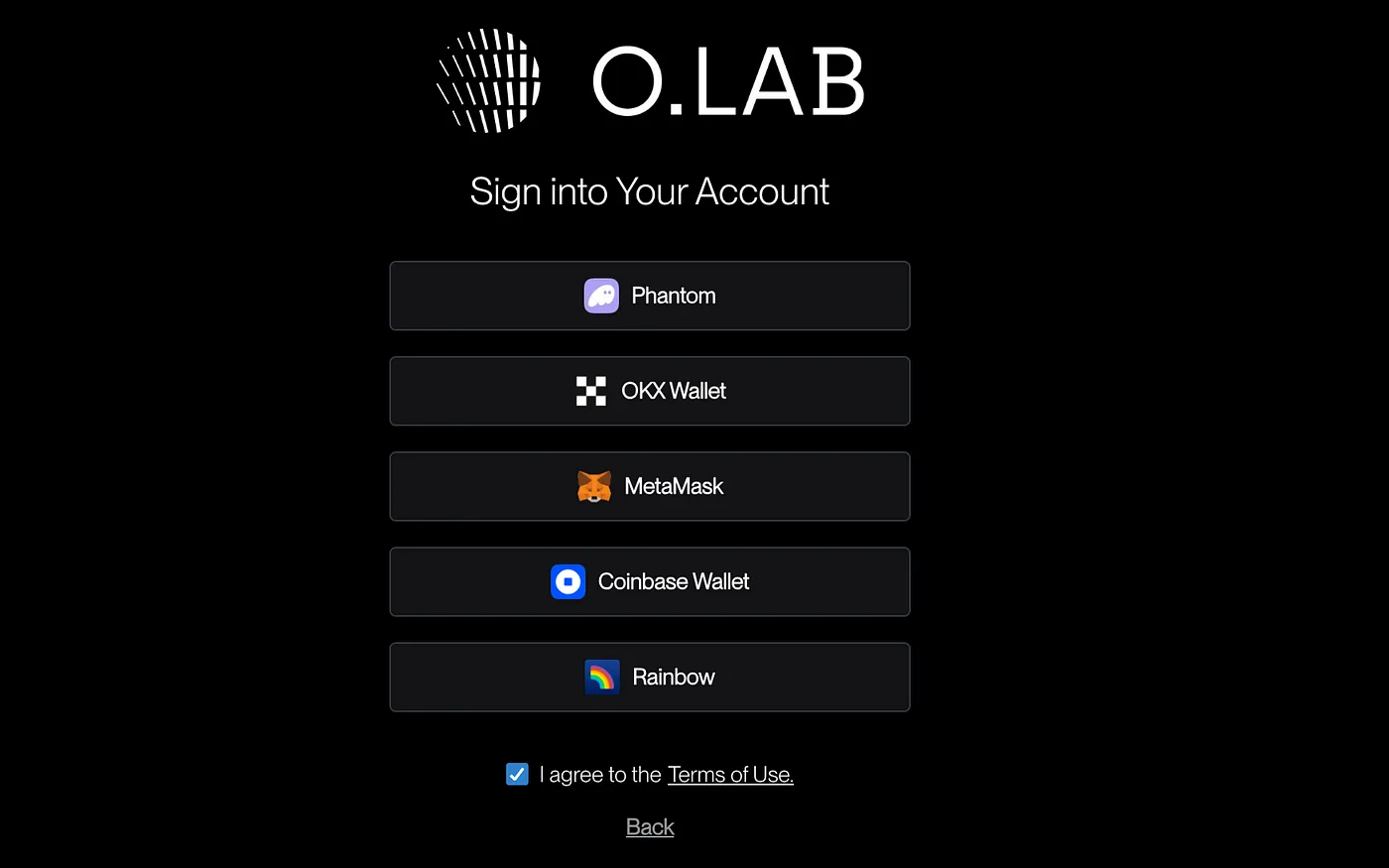 在弹出的窗口中,选择您要使用的钱包(例如 Phantom、MetaMask、OKX Wallet 或 Coinbase Wallet)。您的钱包扩展程序将会出现。按照提示确认连接和签名。完成此步骤后,您将成功使用钱包登录 O.LAB 平台。