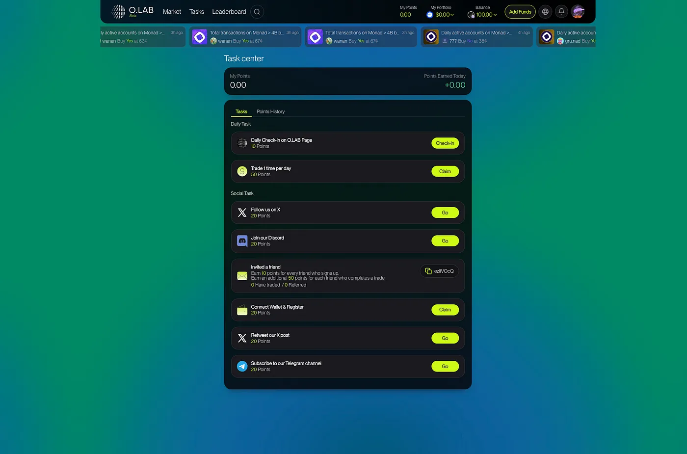 O.LAB积分体系是用户参与的重要凭证,用于记录用户的社交互动、交易行为以及对社区发展的贡献,用户可以通过参与社交任务、交易等方式获得积分。