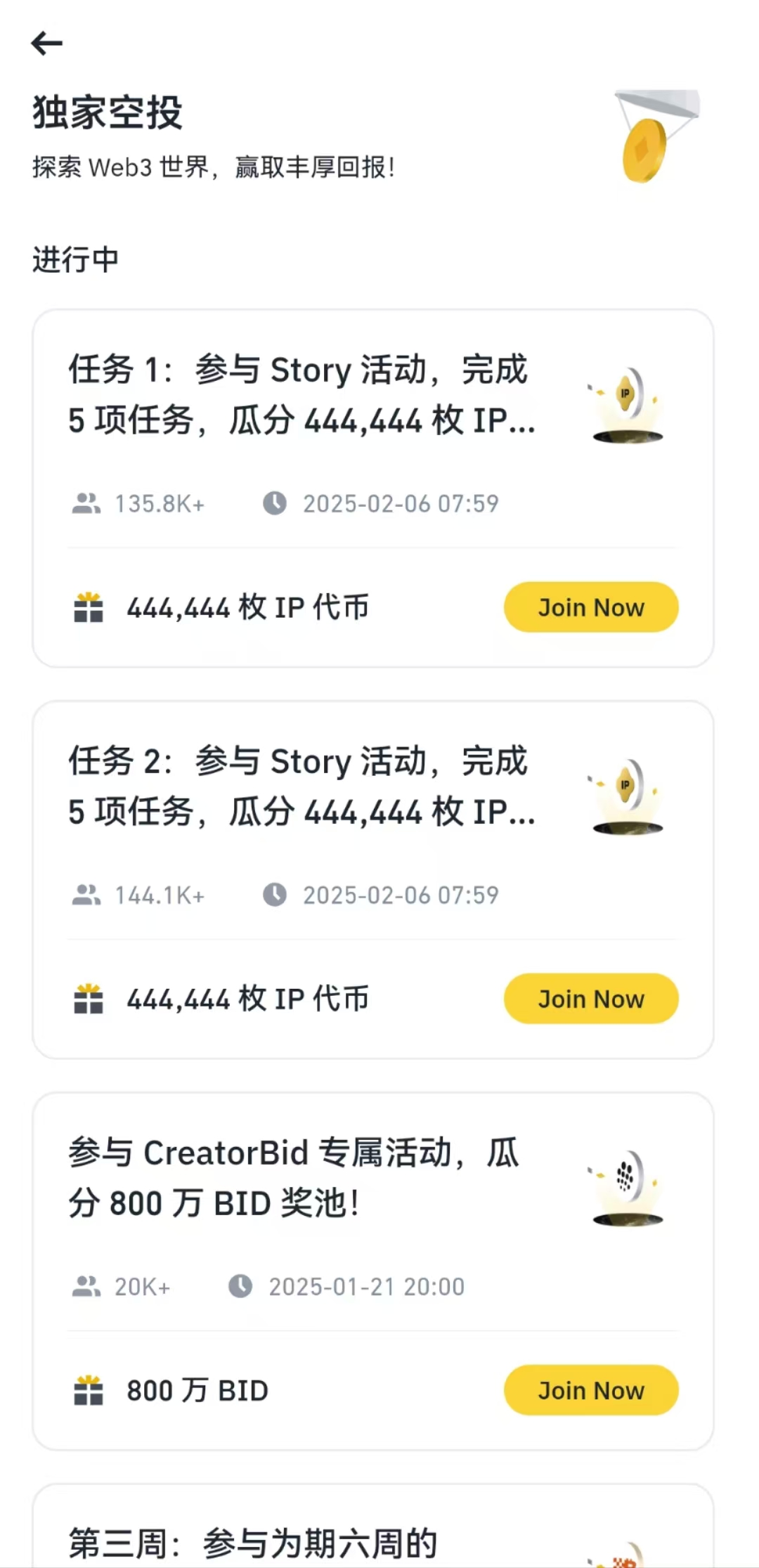 打开币安App->Web3首页->独家空投->往下拉看到Story的活动: