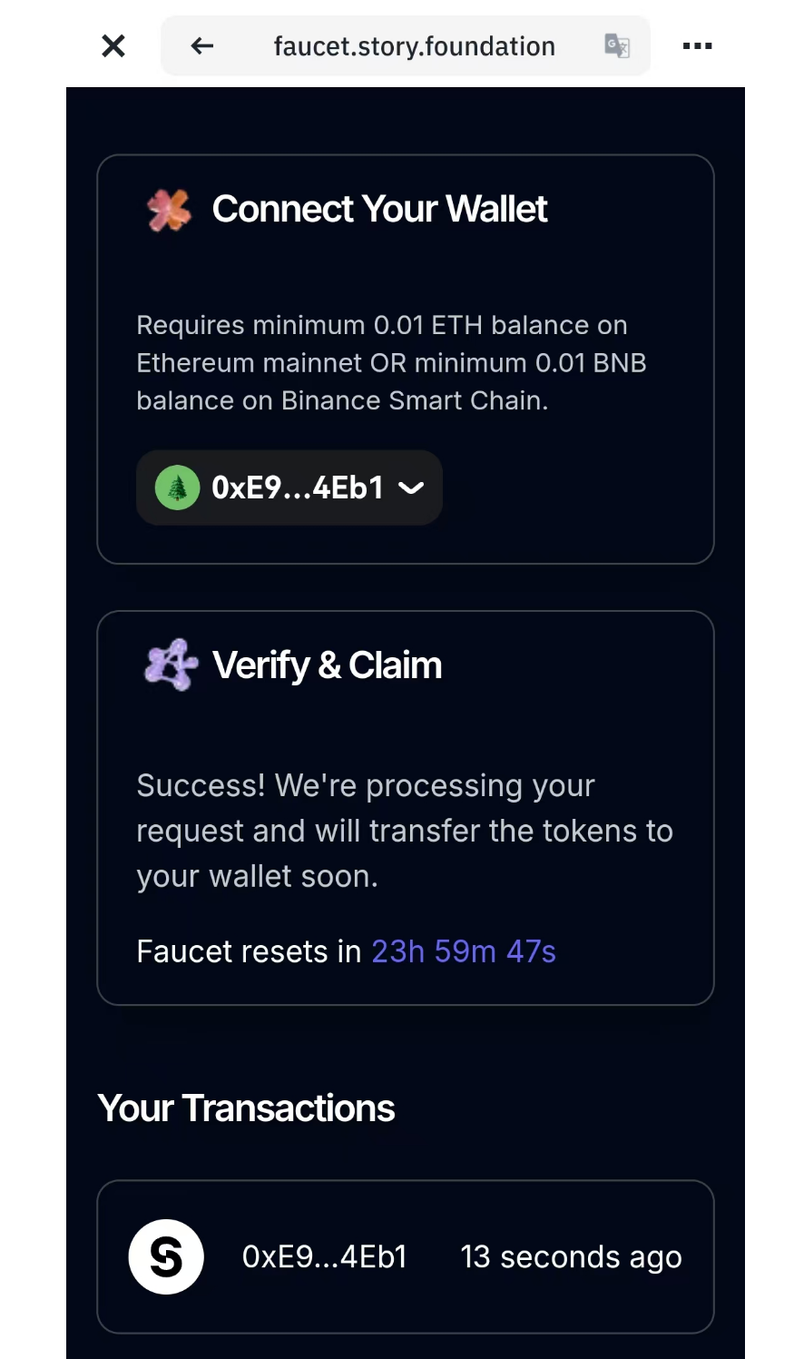 最后一步”Last step“, 点击Mint, 进入领水页面: