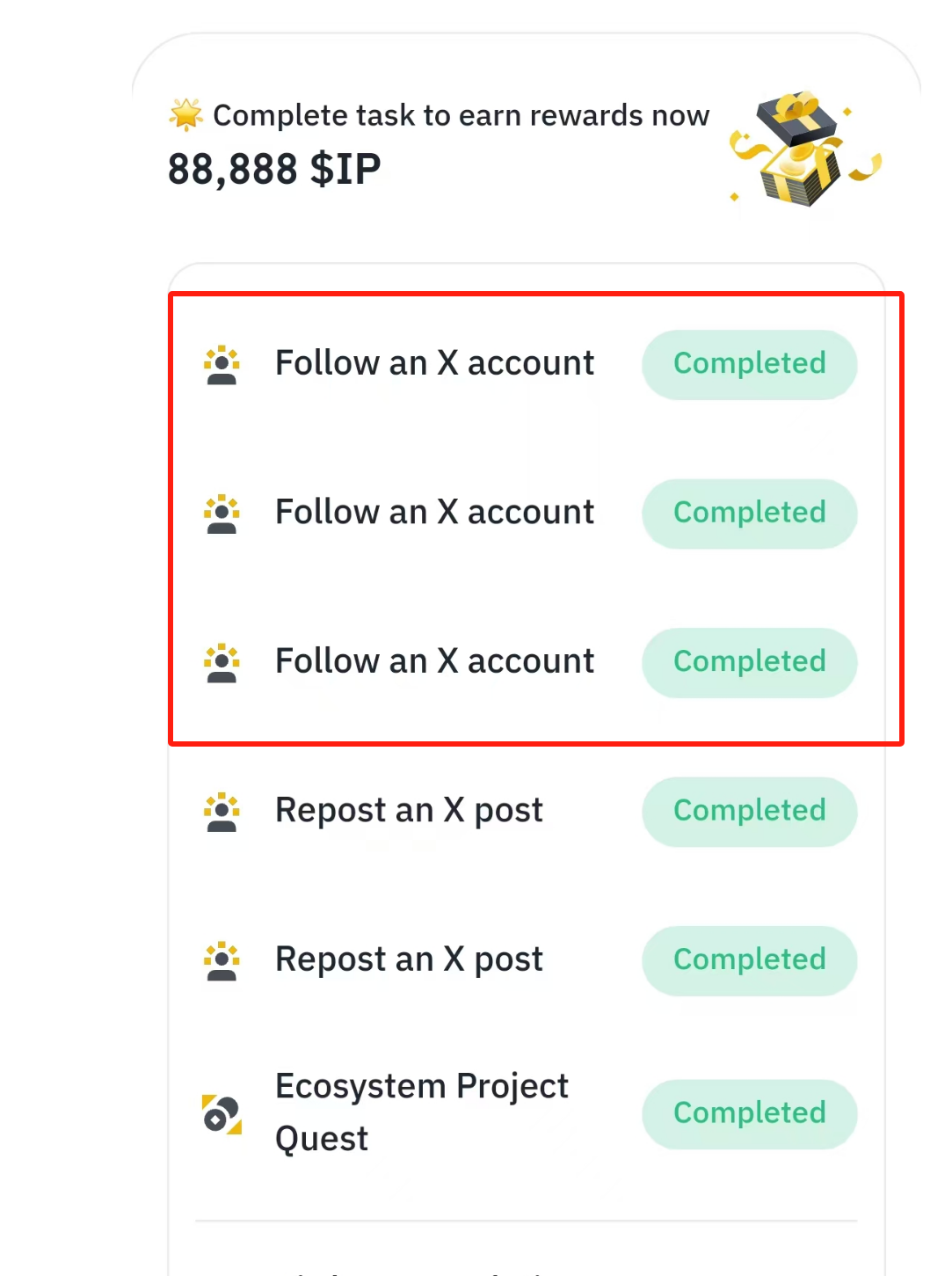 最后所有选项都完成后,点击”Ecosystem Proiect Quest“ 请求,即可快速完成所有任务。