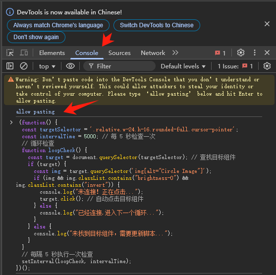 console.log("未连接!正在点击...");